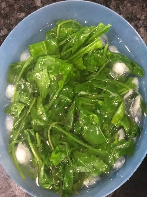 Put a pot of water to boil. Once it starts to boil, add the spinach leaves and lower the flame. Let it cook for about 5 minutes. Then add them immediately to the iced water. Use Tongs to transfer the leaves. Let it remain in ice water for about 10 minutes as the leaves need to cool down completely and ice water will lock the bright green colour of the spinach.