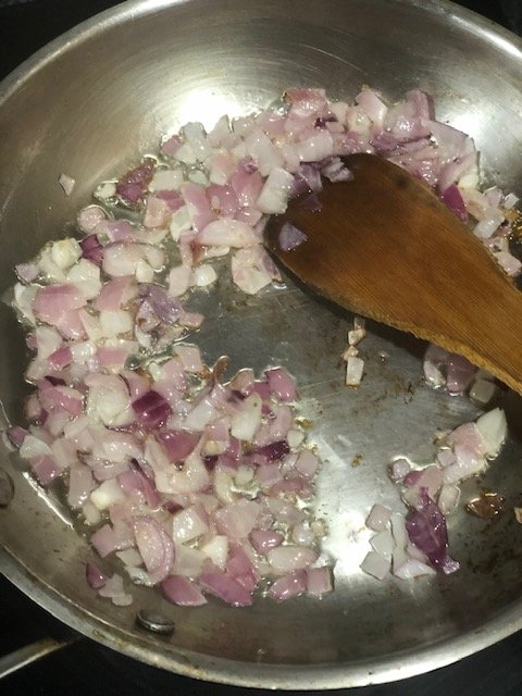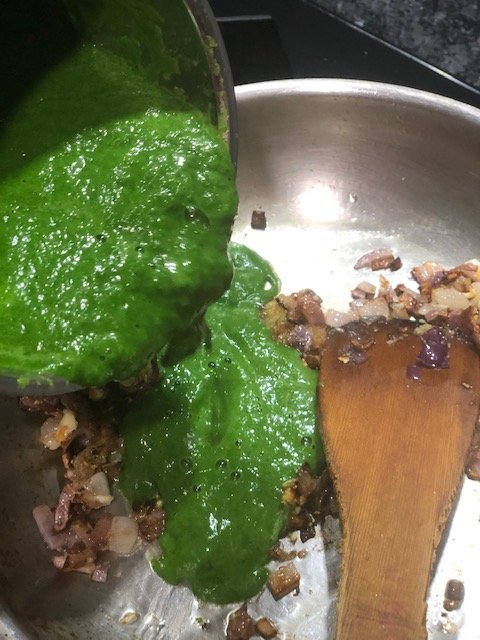 The ground spinach must be this smooth and onions slightly brown and soft. Lower the heat before adding the spinach.