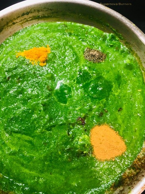 Stir it for a minute on low flame and then add the spinach paste. Stir it well. Add a little water in the grinder to remove all the stuck spinach paste and pour it in the pan.