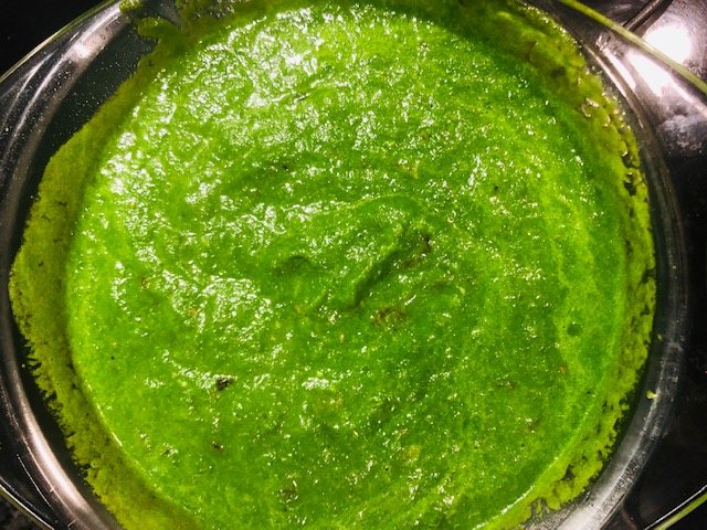 After 10 minutes, Take the leaves out in a grinder, add 2 tablespoons of chopped garlic and grind to a smooth paste. Keep it aside.