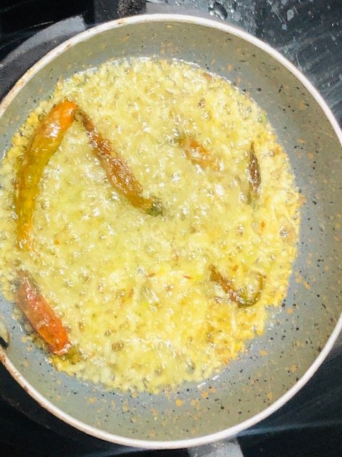 Heat some butter or ghee in a small pan, add the cumin seeds. Once they start to brown, add the rest of the chopped garlic. Add the chillies and when the garlic starts to crisp, add the hing powder.