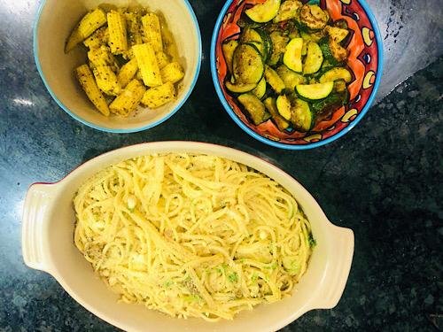 Spaghetti Aglio e Olio with Stir-fry Zucchini and Herbed Baby Corn