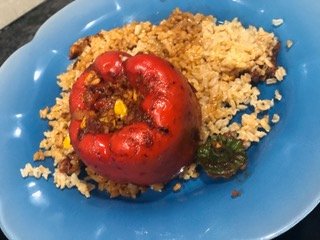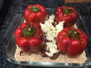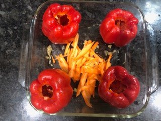 Take a glass dish, spray some butter or oil, put the rice in the dish and even it out. Then put the 4 capsicum on the 4 Corners.