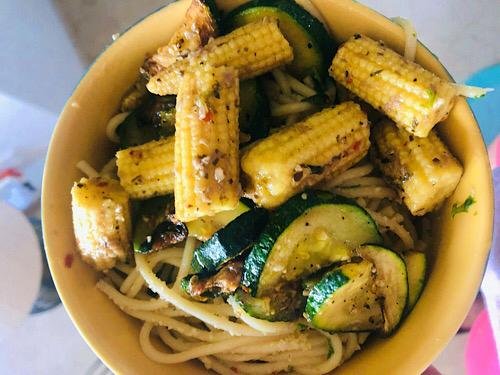 Spaghetti Aglio e Olio with Stir-fry Zucchini and Herbed Baby Corn