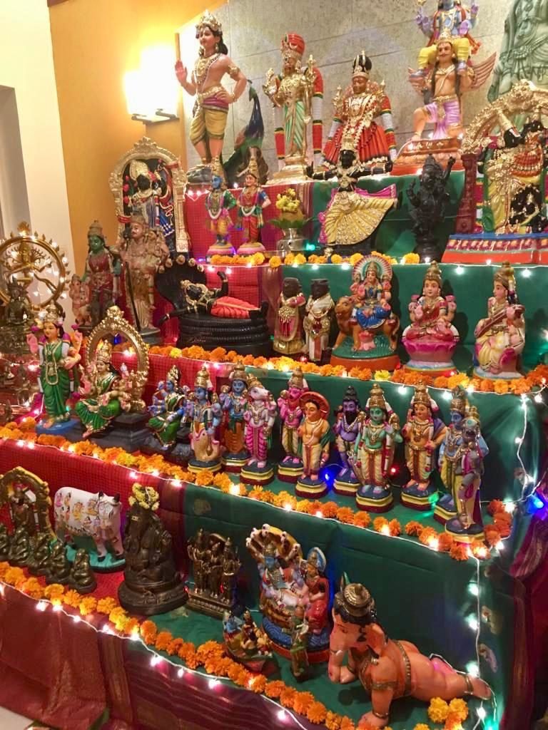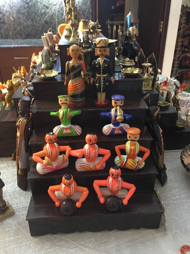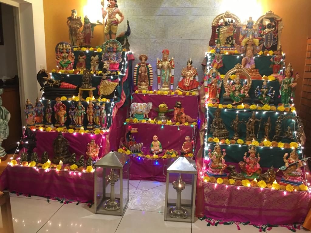 Golu is a simple tier wise arrangement of wooden planks, with idols of deities called Golu Dolls. During Dusshera, the houses in Tamil Nadu display ‘Golu’ in beautiful ways. Some are very elaborate, while some are simple. The arrangement of idols in the Golu tell stories of Goddess Durga while fighting Demon Mahishasura or stories from Ramayana and Mahabharata. During the ten days, people visit each other’s houses and exchange gifts and sweets. On ninth day, Saraswati Puja is done, when books and musical instruments are placed in the puja. Tenth day is Vijayadashami, and is considered the most auspicious day. The idols and the planks are all removed after the tenth day and stored for next year celebrations.