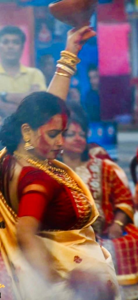 Dhunuchi dances are performed during the evening aarti. Dhunuchi is a small mud vessel that holds fire. The dance is done holding this on Dhaak (kind of Drum) beats.