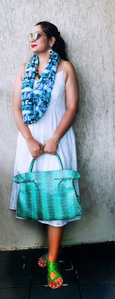 White cut work dress from Sarojini nagar; scarf from linking road; bag was gift from a friend ; glasses from Christian Dior; sandals- my favorite.