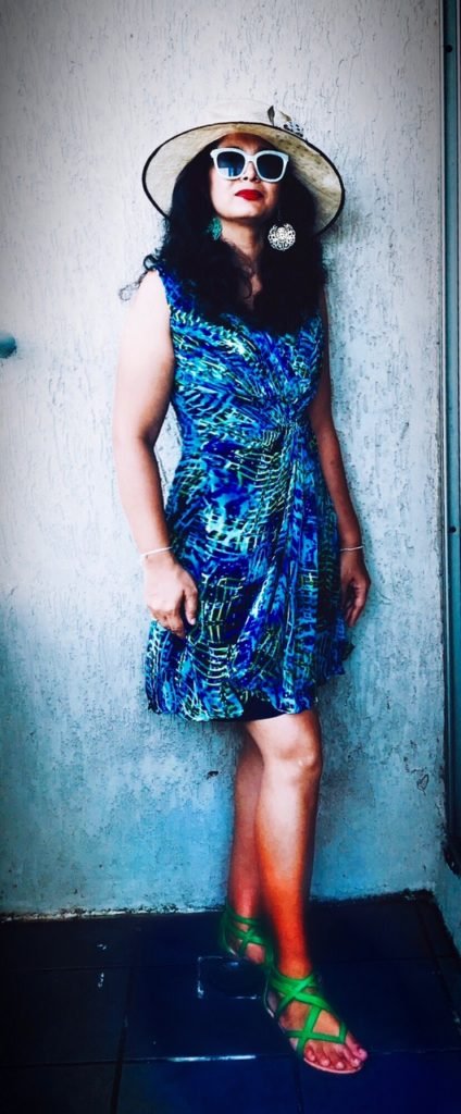Hat from Marks and Spencer; glasses from forever 21; earrings from lifestyle; knot dress; and green sandals.